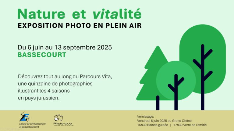 Du 6 juin au 13 septembre 2025, la Société de développement et d’embellissement de Bassecourt et Berlincourt (SEB) invite la population à une découverte originale et gratuite : une exposition de photographies en plein air intitulée Nature et Vitalité. Disposées le long du Parcours Vita au sud de Bassecourt, entre pâturages et forêts, ces images mettent à l’honneur la nature jurassienne au fil des saisons, grâce à une collaboration avec le Photo-club Vallée de la Sorne. Cette initiative allie culture, activité physique et émerveillement local, dans un esprit de convivialité.